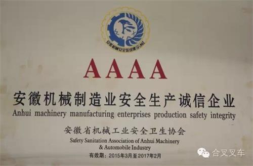 日前,安徽合叉荣获2015年度安徽省机械制造业“安全生产诚信AAAA级企业”荣誉称号。