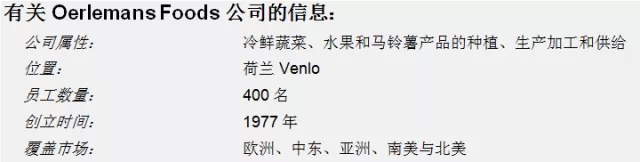 目前Oerlemans foods公司在有机和生态蔬菜、水果、马铃薯产品快销细分市场中引领欧洲市场。自1977年创立以来,这家总部位于荷兰的公司已发展成拥有400多名员工,年营业额近2亿欧元的大型食品公司。由它种植、生产加工的175,000吨冷鲜蔬菜、水果和马铃薯被销往全球50多个国家。Oerlemans Foods公司特别强调“冷鲜”一词。营销经理John Korsten解释说,“以豌豆为例,豌豆收割以后会在三个小时以内被送往零下20摄氏度的冷藏库进行存储。这意味着产品不仅十分新鲜,质量也很稳定。”他提到,其保鲜效果完全可以与新鲜食品媲美。事实上,Oerlemans Foods公司的所有产品均以这种方式进行处理。