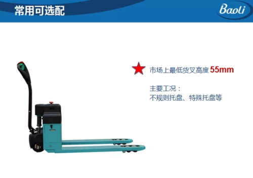 6、史上最低货叉高度55mm,适合各类托盘高度的叉取。