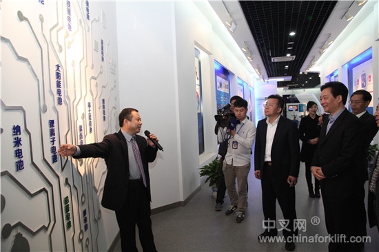 图为张天任董事长向媒体团一行介绍天能产品技术