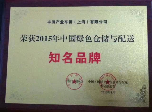 2015年4月,由中国仓储协会主办,国家商务部流通业发展司指导,“第二届中国(国际)绿色仓储与配送大会“在西安召开。经过国内外专家的权威评定,丰田叉车荣获“2015中国绿色仓储与配送知名品牌”称号,并且丰田8系列电瓶式叉车成功入选《中国绿色仓储与配送技术与设备推荐目录(第一批)》