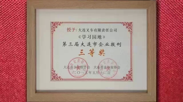 近日,在大连市企业家联合会与大连市企业家协会联合主办的“第三届大连市企业报刊评选”活动中,大连叉车有限责任公司厂刊《学习园地》在众多企业参选作品中获得三等奖。