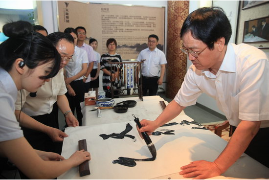 在参观天能集团企业文化展厅后,孙文友兴致勃勃现场泼墨挥毫,“天行健,能无限”,几个斗笔大字虬劲有力,赢得陪同领导经久掌声。临别时,孙文友特地叮嘱张天任希望你们企业越办越好,争取早日超千亿。