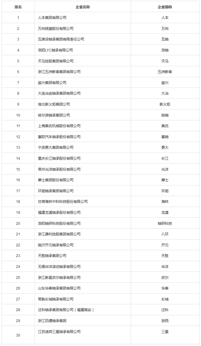 根据中国轴承行业协会对2013年全国96家主要轴承生产企业的统计,2013年中国轴承生产企业销售额排名前30名的企业企业名单如下: