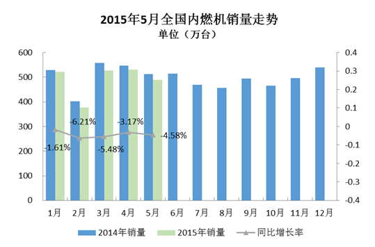 根据中国内燃机工业协会《中国内燃机工业销售月报》重点企业数据显示,2015年5月完成内燃机销量489.13万台,环比下降7.65%,同比下降4.58%,同比累计下降4.30%;5月完成17542.81万千瓦,环比下降11.13%,同比下降2.52%,同比累计增长0.18%。乘用车市场仍好于行业平均水平,同比累计增长8.03%,而柴油机市场总体状况继续下滑,同比累计降幅达到了20.38%。