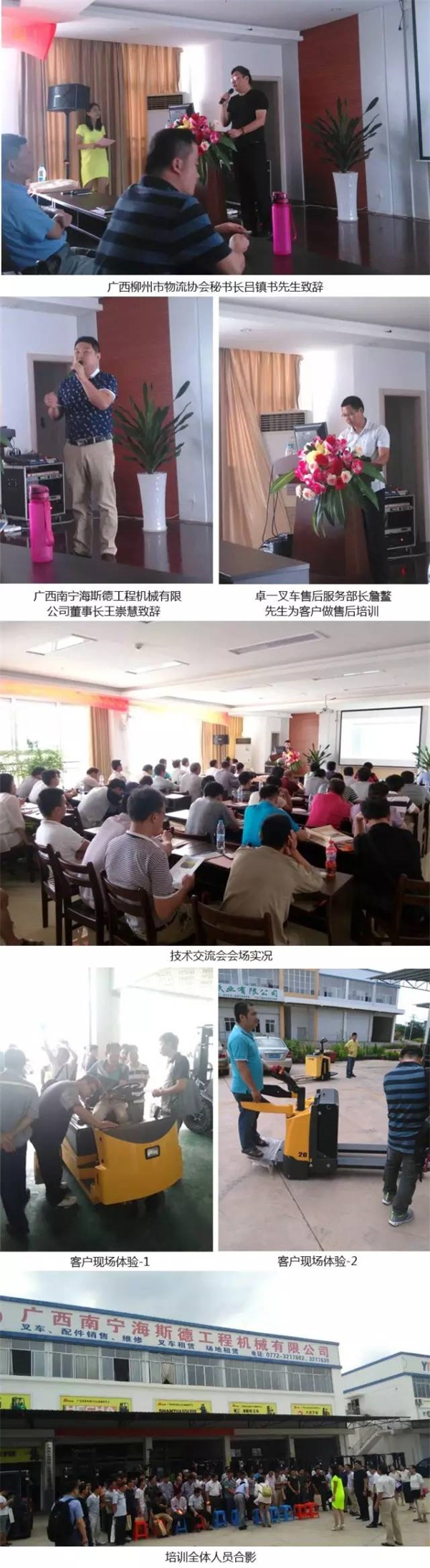 卓一叉车携手南宁海斯德举办技术交流会反响热烈2015年6月26日,“南宁海斯德叉车培训暨技术交流会”在柳州桂中海迅物流基地成功举办。会议邀请到柳州当地众多行业人士包括五菱物流等重要客户,卓一电动牵引车和电动搬运车受到客户关注。卓一叉车广西总代理南宁海斯德工程机械柳州分公司,为柳州及周边客户提供更好更快捷的服务支持。 海斯德董事长王崇慧先生在致辞中提到,近年来电动仓储车在企业中的应用越来越广泛,卓一电动工业车辆以一贯优良的服务与质量赢得了柳州以及广西各地客户的口碑,在汽车生产及其配套企业中正拥有越来越大的影响力。卓一售后服务部长詹鳌先生简要介绍了卓一的近况以及各类车型,之后针对车辆的售后维护与保养做了详细的讲解并与大家展开提问互动,讲解过程中数次被客户的问题打断。现场用户在下午举行的室外实车演示时表现出很高的热情,客户们踊跃驾驶卓一叉车,体验其优越的操控性。 下面就让我们一起来回顾下交流会的精彩瞬间: