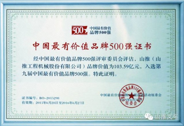 6月28日,由《品牌观察》杂志社主办的第九届“中国最有价值品牌500强”颁奖盛典在广州隆重举行,盛典揭晓了“中国最有价值品牌500强”榜单,山推以强大的品牌实力荣登本届中国最有价值品牌500强,经评估的品牌价值为103.59亿元。