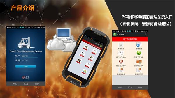本项目产品核心技术包括:1)叉车租赁管理系统,从Excel文档到系统化管理;2)叉车维修管理系统;3)移动端维修管理系统;4)物联网叉车远程管理与数据采集;5)条码化配件管理 5)基于公司圈和设备圈的共享交互平台;6)柔和互联网、APP、条形码、物联网、大数据分析等前沿科技,实现整个行业的资源整合 。