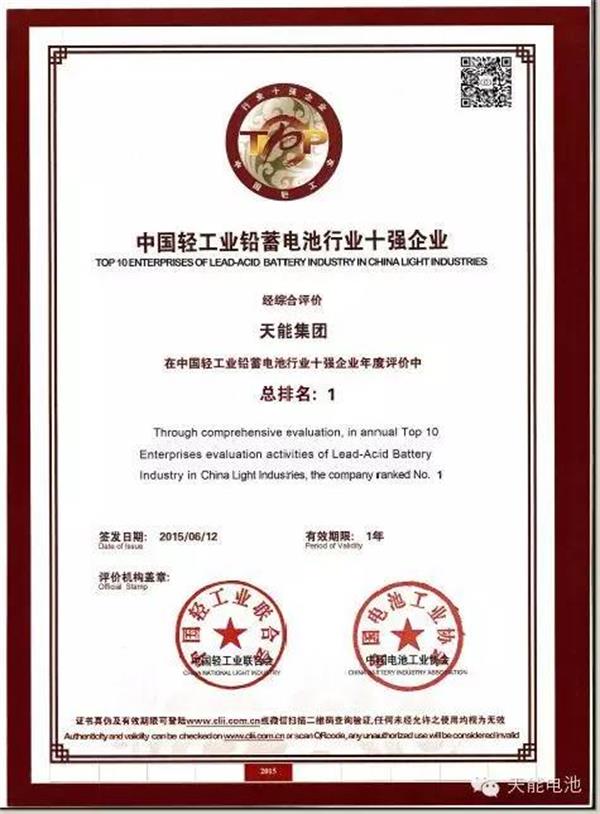 2015年6月12日,天能在以"新常态、新驱动、新思路"为主题的笫四届中国轻工企业家高峰论坛暨轻工百强企业颁奖盛典会上荣获"2014年度中国轻工业蓄电池行业十强"第一,这也是行业内含金量最高的奖项,没有之一。该榜单是由中国轻工业联合会对2014年度企业营业收入、利润总额、利润率,电子商务收入、研发投入等指标进行评分,旨在弘扬榜样力量、展现行业领先企业风采。天能集团此次凭借优秀的市场表现与突出创新能力,在年度综合、市场能力、盈利能力等全部六项指标榜单中脱颖而出再度荣登行业十强之首,至此,天能集团已连续18年位居中国蓄电池行业第一。可见天能业绩与自身发展实力雄厚,得到了社会各界的高度认可。