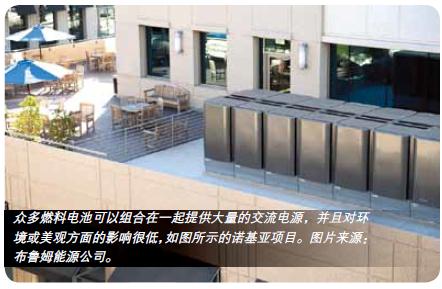 Gino指出,经济的可靠的天然气和沼气资源为扩大燃料电池的使用提供了稳定的供给以及有吸引力的经济的方案。迄今为止,在美国和日本一共装备了超过140MWe的容量。大规模的单体安装包括犹他州的易趣公司的6MWe,北卡罗来纳州的苹果公司的10MWe, 以及特拉华州德玛瓦半岛的30MWe。