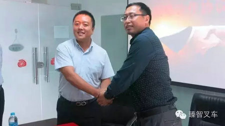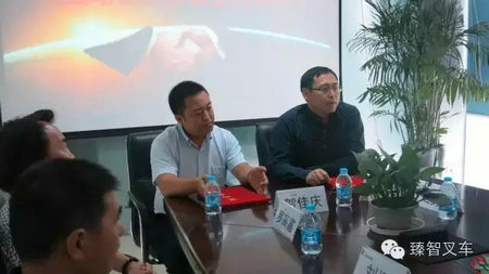 在仪式开始前,双方总经理进行亲切交谈,均表示双方的合作希望能更进一步,一起铸造更好未来,十一时三十分仪式正式开始,臻智公司总经理戴云保先生首先讲话,对顺丞公司作大致的介绍,顺丞公司是国内第一家进口二手叉车公司,对二手车的货源、信息有各种优质渠道,在国内也一直处于领先地位,臻智一直与其有密切合作,由于臻智公司在全国有众多租赁网点,业务范围广,双方的合作空间非常大,此次战略合作协议对于双方而言都是极其优质的合作,并表明我们有信心做的更好!随后,顺丞公司的贺总发表讲话,顺丞与臻智已经有很多年的合作关系,感谢长期以来臻智的支持与帮助,希望与臻智公司形成长期、稳定的精诚合作关系!讲话结束后,两位总经理在签约本上写下隆重的一笔,双方签约成功!
