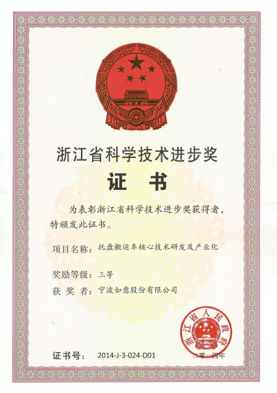 近日,公司“托盘搬运车核心技术研发及产业化项目”通过浙江省科技厅专家组审查、二轮评审答辩、公示等环节,被评为2014年度浙江省科学技术三等奖,由浙江省人民政府颁发奖励证书。