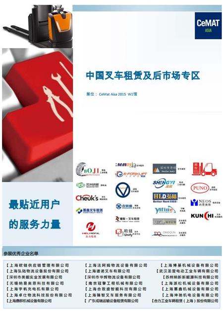 CeMAT ASIA 2015展会上,首次设立的“租赁及后市场专区”是中国叉车后市场力量的集中展示,经挑选的二十家的叉车,是中国叉车后市场的中坚力量,历史上第一次联合在一个屋檐下。专区的口号是:最贴近用户的服务力量!