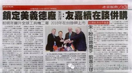 友嘉日前并购才传喜讯,成功并购德国MAG集团工业自动化系统事业,及瑞士知名多轴加工机龙头厂Pfiffner ,友嘉集团全球自动化生产设备商地位由全球前十大,已经跃升为全球第三大,仅次于DMG、MAZAK的切削工具机业者,完成MAG及Pfiffner整合后,年营收估计增加约230亿台币。