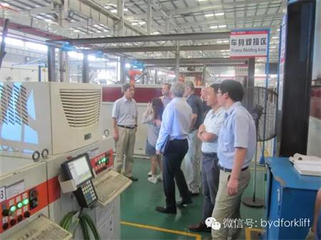 考察团一行首先参观了叉车展厅,比亚迪叉车事业部总经理毕国忠先生详细的介绍了比亚迪电动叉车的六大系统以及核心优势的电池和电控技术。Cal-Lift十分专业,对门架性能以及驾驶安全舒适等问题进行了询问,我们的技术人员都一一详细解答;下午,考察团队来到生产线进行参观,近距离观看了焊接、打磨、电池装配等过程,对比亚迪现代化的设施和管理给予了高度肯定;之后来到试制车间,观看比亚迪叉车两款新车型--5T和25T牵引车,现代感十足的造型设计深深吸引了考察团的目光,纷纷赞叹不已,并郑重表示“I am ready to buy it”。