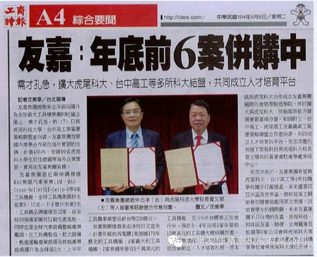 友嘉集团跃升为全球最大工具机集团之一,需才孔急,前日,与虎尾科大,台中高工等签署策略联盟意向书。友嘉集团首开先例计划四年内,安排90名虎尾科大学生前往德国等海外企业实习,费用由友嘉集团负担。