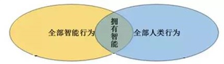 图灵测试与人工智能的关系可以用集合的概念进行阐述,如上图所示。从图中可以看到“所有人类行为”对应的集合“和所有智能行为”对应的集合有交集但又互有不同。虽然“在全部智能行为”中有部分能力是人类靠自身力量无法完全实现,但人类可以被认为是有智能标准体,因此,能达到“人类水平”的部分— 也就是两个集合交集的那个部分—就应该被认作是“拥有智能”的特征。而且,人类的所有行为并不总是和智能相关。图灵测试要求机器全面模拟“所有人类行为”,其中既包括人类“智能”的部分,也包括人类的“非智能”行为,由此可得出结论通过图灵测试是 “拥有智能”的一个有效的充分条件,而非必要条件或充要条件。【以上内容引用微软研究院】