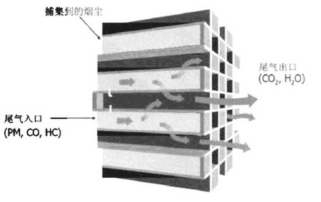 壁流式DPF用一个类似蜂窝的载体结构过滤气流中的颗粒,尾气流入DPF后,气流通道在出口端是堵塞的,尾气被迫透过流道壁进入相邻的孔道,颗粒物无法通过被沉积下来,成为积存的碳烟(参见图1.2)。DPF首先应用于轻型柴油车领域,但随着排放法规(欧Ⅵ,US2007,JapaIl2005标准)的加严,重型柴油车也不可或缺。