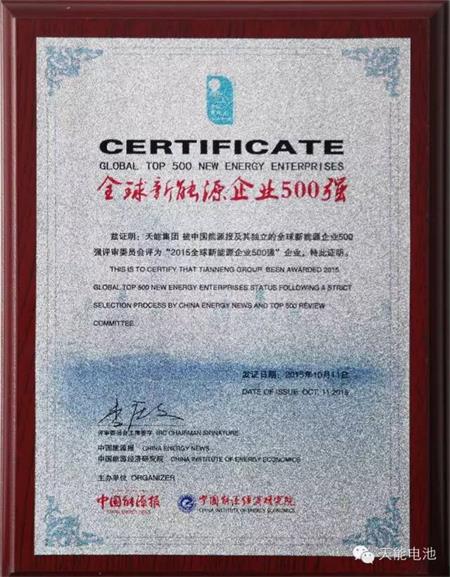 2012年,天能集团凭借在储能电池领域的优势,被评选为全球新能源企业500强,天能集团排名第37位。