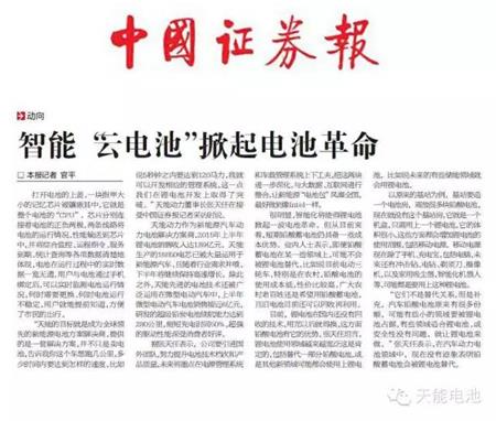 10月10日中国证券报刊登《智能“云电池”掀起电池革命》,将天能用 “互联网+”思维制造出来的创新产品推向高潮。