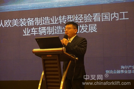 第二天上午8:30,在同一个会议室,来自海尔产业金融物流金融事业部总经理李倜分享了“从欧美装备制造业转型经验看国内工业车辆制造业的发展”,围绕着欧美装备制造业转型模型、案例分析展开了详细的说明。以核心设备为起点,向产品和客户两端延伸,并且在优势产业基础上开展相关多元化,以金融带动服务业务。以服务业务缓冲经济周期,在财务结构转型时,规模依然占据主要地位,但更应该关注低资本消耗。