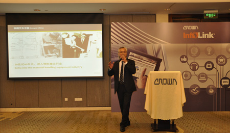在研讨会上,主持人为在座来宾一一介绍了Crown-科朗服务精英团队,包括全国销售总监黄英杰先生、产品沟通和培训经理杨永顺先生及大区经理王晓辉先生等,他们将分别对Crown-科朗叉车在互联技术应用及发展的不同情况作详细阐述。全国销售总监黄英杰先生首先对Crown-科朗公司的起源、发展与服务进行了简要介绍。Crown-科朗于20世纪60年代进入物料搬运行业,目前在中国有上海和苏州两大供应基地,服务范围涵盖了非常广泛的行业领域。科朗叉车商贸(上海)有限公司提供了全系列的电动叉车,从手动托盘搬运车到特窄通道三向叉车(VNA)和Wave多功能拣选车,同时还提供二手叉车销售业务。