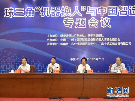 会当凌绝顶,一览众山小。当前,全球范围内新一轮产业革命正迅猛爆发,抢占新一轮产业竞争高地、占领智能制造行业竞争制高点已成为世界各国核心战略之一。面对“德国工业4.0”、日本的《机器人新战略》和“美国工业互联网”,珠三角地区如何把握“中国制造2025”机遇,在智能装备制造业强手如林的全球舞台实现弯道超车?29日,由新华社广东分社联合参考消息报社主办的“珠三角‘机器换人’与中国智造的未来专题会议”举行,会议吸引了来自珠三角10多个地市约150名代表,共同探讨中国“机器换人”的机遇和挑战,交流珠三角“机器换人”生动实践,并对广东未来创建制造业强省的目标建言献策。