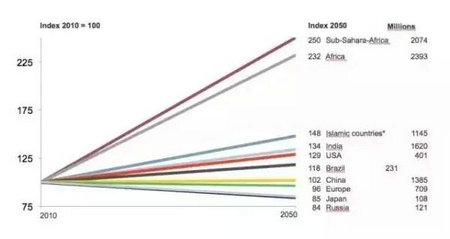 人口会决定经济实力,人口结构已经说明很多了,这是联合国的预测——不同人口国家的发展。2010年的指数是100,非洲的人口数量会翻番,我们会看到非洲人口会有爆炸式的增长,现在是10亿人,到2050年会超过20亿。另外还有伊斯兰国家人口增长也会很大,还有印度、巴基斯坦。中国的增长是比较稳定的,而欧洲、俄罗斯、日本根据这个预测,人口会缩减。