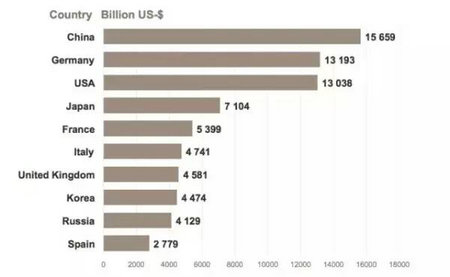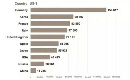 在全球竞争中,尤其在出口方面,通常我们会看每年的出口额,现在看这个数据中国全球最高,德国是第二,稍微比美国高一点,其他国家就低多了。我们再看一下人均出口额,德国则远远超出其所有他国家,德国的人均出口额,是像法国、意大利、英国这样国家的两倍。很多人都觉得那些大公司可能在出口方面起着决定性的作用,是这样吗?