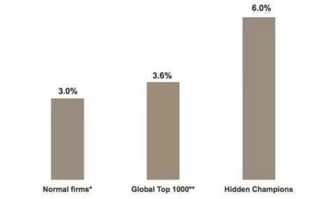 隐形冠军的员工们一个人能干好几个人的活,这样他们的员工才比较少,这就是生产率,如果你的员工非常多,会降低生产率。另外这些企业都有高绩效的文化,高业务的素养,人才流失率很低,而且对于这些隐形冠军来讲,在职的培训是非常重要的。