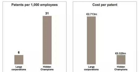 创新首先是需要投入的,隐形冠军跟普通公司或者和全球100强的企业相比,他们在研发上的投入更多,是一般公司的两倍。从每一千名员工拥有的专利数量来看,隐形冠军的企业每千名员工拥有31个专利,而大型企业只有6个。所以他们单位员工的产出率要比一般的公司多出5倍,而且专利的成本只是一般企业的1/5。