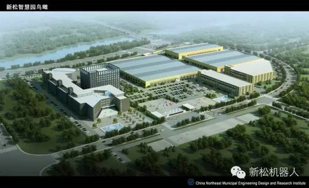 位于沈阳的新松智慧园设计鸟瞰图及数字化工厂实景一角