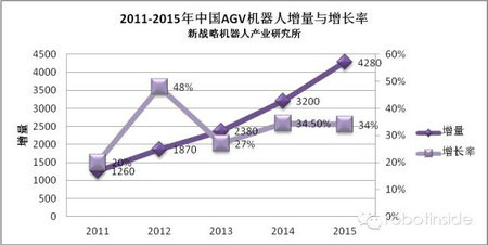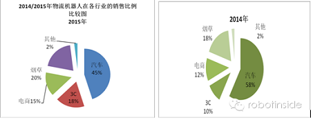 移动机器人AGV作为国产工业机器人的翘楚, AGV在制造业应用中以其高效、准确、灵活地完成物料的搬运任务。并且可多台AGV组成柔性的物流搬运系统,搬运路线可以随着生产工艺流程的调整而及时调整,使一条生产线上能够制造出十几种产品,大大提高了生产的柔性和企业的竞争力。AGV作为基础搬运工具,AGV的应用深入到机械加工、家电生产、微电子制造、烟草等多个行业,生产加工领域成为AGV应用最广泛的领域。但并未在以上机器人数据统计口径之中,根据新战略机器人产业研究所的跟踪总观察,AGV机器人产业2015年实现平稳发展的同时有部分应用领域增长迅速。