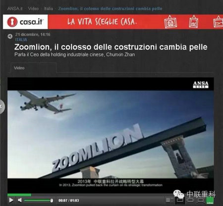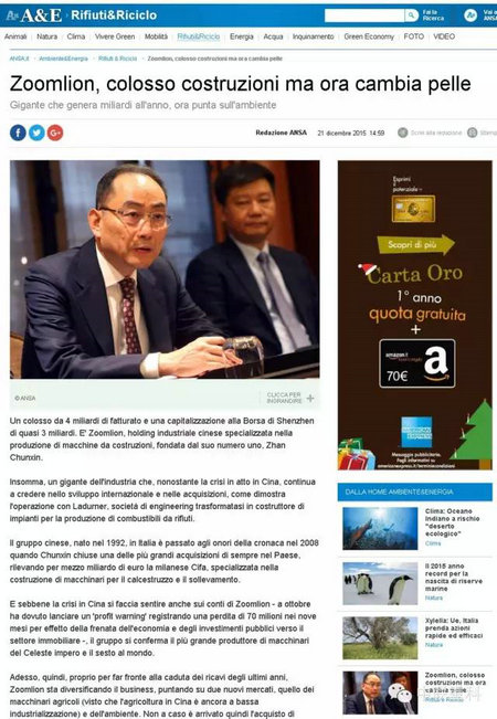 意大利知名国际通讯社安莎通讯社(Agenzia nazionalestampa associata,ANSA)今日在其网站首页连续重磅发布三篇报道,聚焦中国企业中联重科收购意大利领先环保企业LADURNER(纳都勒)公司,中联重科董事长詹纯新,公司副总裁、环境集团总裁张建国接受了安莎社记者的专访。