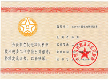 近日,浙江佳力科技股份有限公司与总后勤部建筑工程研究所共同开发研制的“2010-0.4蓄电池防爆叉车”项目,荣获军队科技进步奖二等奖。我公司总工程师陈勇以项目负责人之一的身份,加入该项目研制的项目组,成为重要的项目完成者之一,荣获军队科学技术进步奖二等奖。