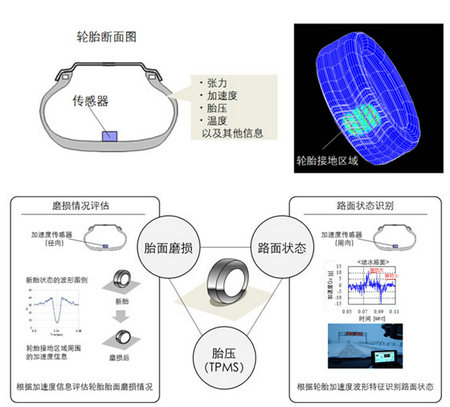 (1)装配在轮胎胎面内侧的加速度传感器检测到轮胎胎面的振动,将此信息无线传送至车载分析装置。此系统由同样安装在轮胎内的独立发电装置驱动。