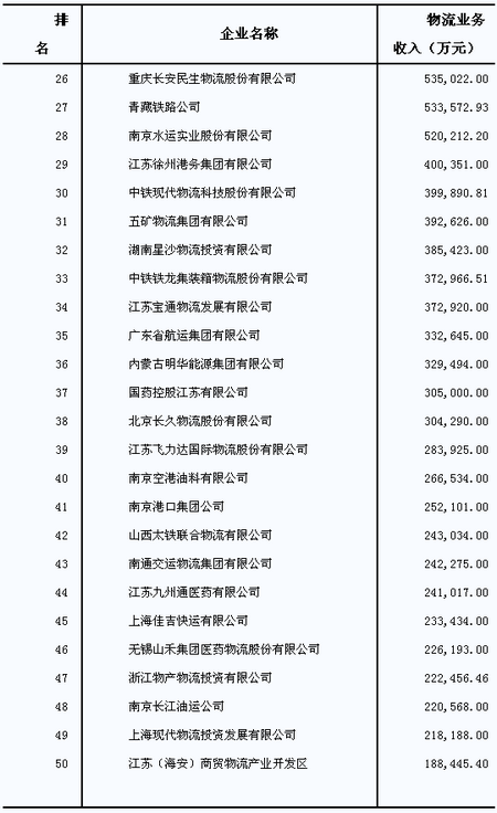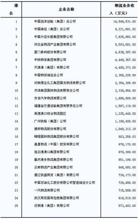 根据国家发展改革委、中国物流与采购联合会《社会物流统计核算与报表制度》的要求,我会组织实施了重点物流企业统计调查,根据调查结果,提出了中国物流企业50强排名。