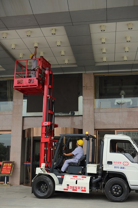 多功能车载叉车最独特、最大的创新在于采用一个发动机、两个驾驶室,前后两个驾驶室都配有独立的操作系统,起升重量为2.5吨,载重量为3.5吨,举升高度达6米,已获得国际PCT专利认证。车载叉车彻底突破了传统叉车不能上路行驶的局限,能满足不同用户的多种需求,适应不同路况的作业要求。通过加装不同的作业模块,可实现高速机动叉车作业、快速转场、道路清障救援、城市物流搬运、消防清障、抢险救援、野外迁徙作业、高空作业、机场港口仓储货物装卸转运等多项作业功能。