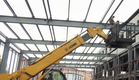 在4S店施工现场,徐工17米级伸缩臂叉装机子啊狭窄的区域内操作灵活,进退自如。与工地负责人沟通后了解到,以前用吊车作业,狭窄区域内吊臂操作不灵活,还有一定的危险性,工作效率也不高。使用了徐工的伸缩臂叉装机后,在坑洼不平的路面行驶稳定性极高,货叉托盘可以直接把墙砖送到指定区域,速度又快,还能带载作业。安装钢结构横梁和连接钢索时,人和物料一起举升在高空作业平台上施工,效率高还安全,配个铲斗往高处送个泥灰儿,铲斗比吊车装的多,效率高,节省很多建筑成本。该工地负责人还不停的问:“你们是否还有其他的工作装置,在给我配一些,这个产品使用起来太方便了。”