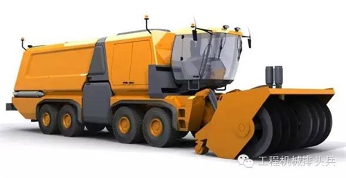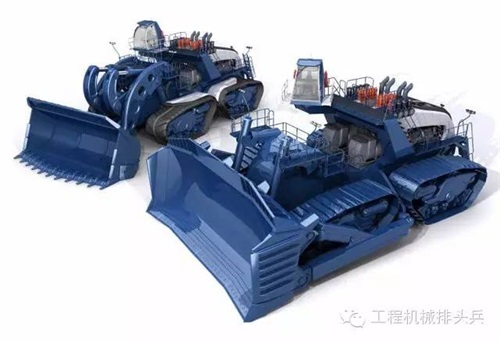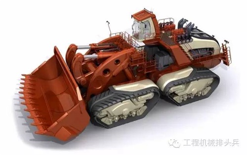超级装载机,铲斗容积足有75立方的装载机,75立方是什么概念???一栋25平方米的房子!!!橡胶履带在这辆超级装载机上再次得到了淋漓尽致的表现。仔细看,与那辆510吨的自卸车是相同的履带结构呢。驾驶室后方,进气的空气滤清器有8个!排气管4根!散热的风扇有4个!!!中间四排红色的是什么???24个灭火器!!!