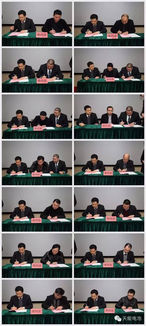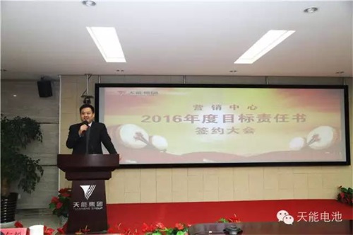 2016年1月12日,天能集团营销中心2016年度目标责任书签约大会在集团内部隆重召开。大会对2015年营销各项工作进行全面总结分析,并对2016年营销改革工作进行了战略部署。天能集团副总裁、营销中心主任周建中、天能集团总裁助理、营销中心副主任佘仁松及营销中心内部各部门近100人出席了本次大会。