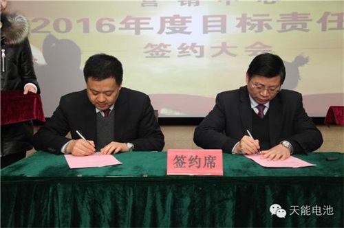 本次会议的重点是集团和各相关负责人就2016年度目标责任书进行签约仪式。周总与佘总及营销中心各部门负责人分别进行了签约,并希望营销体系全体员工深刻认识到改革创新的紧迫性和重要性,要主动拥抱变革,克服求稳怕乱的思想,主动担当,坚定信心,持续学习,强化执行,确保2016年天能营销中心打一场漂亮的胜仗!