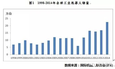 2015年以来,国际经济形势不容乐观,全球经济复苏缓慢,地缘政治及突发事件风险上升。但随着新一轮科技革命和产业变革的孕育兴起,以信息技术与制造技术融合为核心的智能制造、数字制造、网络制造等新型制造模式正在加快发展,发达工业国家和地区均高度重视机器人产业发展,将机器人产业上升为国家战略,以上因素使得全球机器人产业保持快速发展,其中亚洲市场反应尤为活跃。据国际机器人联合会统计,2014年全球工业机器人销量为22.5万台,比2013年增长27%,其中亚洲销量约占2/3,中国、韩国、日本、美国和德国五大市场的销量占全球工业机器人总销量的75%左右。2005-2014近10年间,全球新装工业机器人年均增速约为14%。