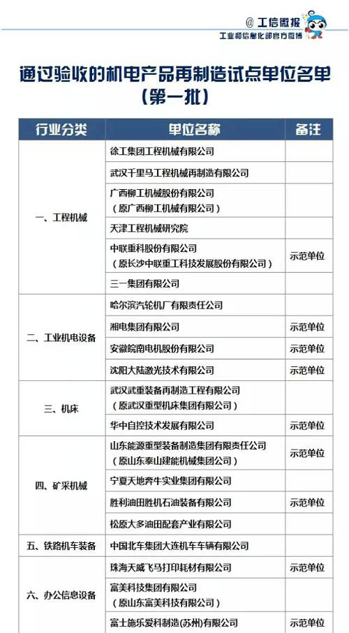 一、徐工集团工程机械有限公司等20家单位(详见附件)通过验收,其中沈阳大陆激光技术有限公司等9家单位确定为机电产品再制造示范单位。