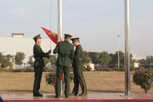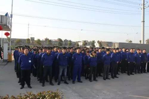 全体员工在公司广场前列队集合,准备参加升旗仪式