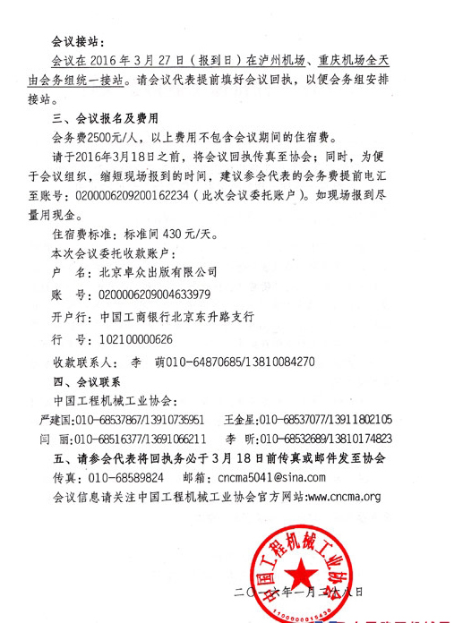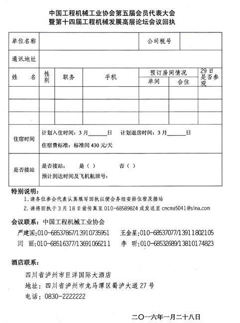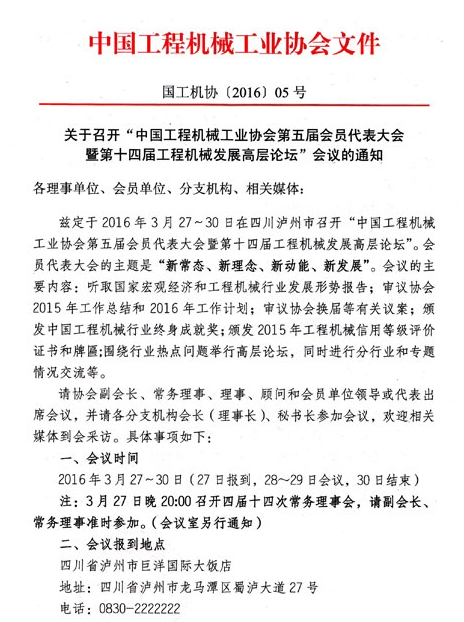 兹定于2016年3月27~30日在四川泸州市召开“中国工程机械工业协会第五届会员代表大会暨第十四届工程机械发展高层论坛”。会员代表大会的主题是“新常态、新理念、新动能、新发展”。会议的主要内容:听取国家宏观经济和工程机械行业发展形势报告;审议协会2015年工作总结和2016年工作计划;审议协会换届等有关议案;颁发中国工程机械行业终身成就奖;颁发2015年工程机械信用等级评价证书和牌匾;围绕行业热点问题举行高层论坛,同时进行分行业和专题情况交流等。