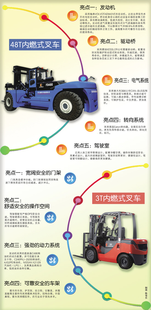 吉鑫祥48吨内燃式叉车(吉鑫祥FD480),是目前国内自行研制生产的最大吨位内燃平衡重式叉车,同时拥有电控发动机技术、小流量比例阀控制设计、新型中央总线控制技术等一系列的独特设计和先进技术。