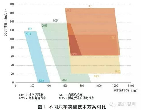 氢燃料优化汽车效率。氢燃料电池电动汽车从本质上讲是一个电动汽车。氢气储存在车上的高压罐内,通过燃料电池将氢能转化成电能给汽车提供动力。能量储存在电池里面,使用电池里的电能可以优化操作效率。由图1可以发现,与内燃机汽车和插电式混合动力汽车相比,氢燃料电池能明显的降低碳排放量,同时其最大行驶里程可以达到纯电动汽车的3倍。