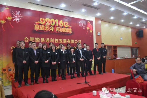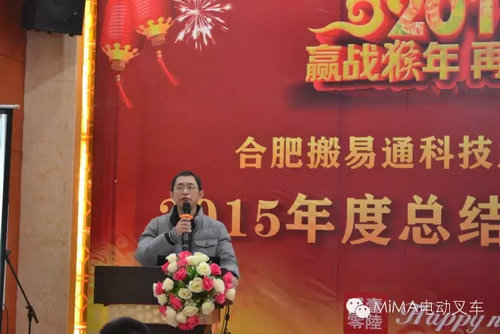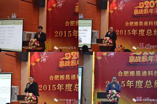 MiMA(米玛)电动叉车总经理韩龙致贺词,并对公司2015年进行了全面的总结,对于2015年公司取得的成绩给予了充分肯定,同时也对2016年公司的整体发展进行了生动详细的描述。各级、各部门领导相继发言,利用丰富的数据统计对比,生动地向全员报道了公司在2015年期间的企业动态和发展历程,并展示规划了2016年的发展和目标。
