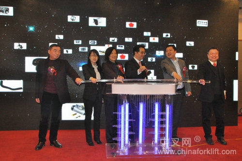 CRALIFT联合创始人周俊峰先生,中国工程机械工业协会工业车辆分会秘书长张洁女士,国家工程机械质量监督检验中心副主任雷晓卫先生,优嘉力(中国)董事长、合肥合锻机床股份有限公司董事长严建文先生及供应商代表——江苏晨光液压刘浩明先生、钻石会员代表——长春镕麟叉车王敏女士共同为CRALIFT平台正式上线揭幕。